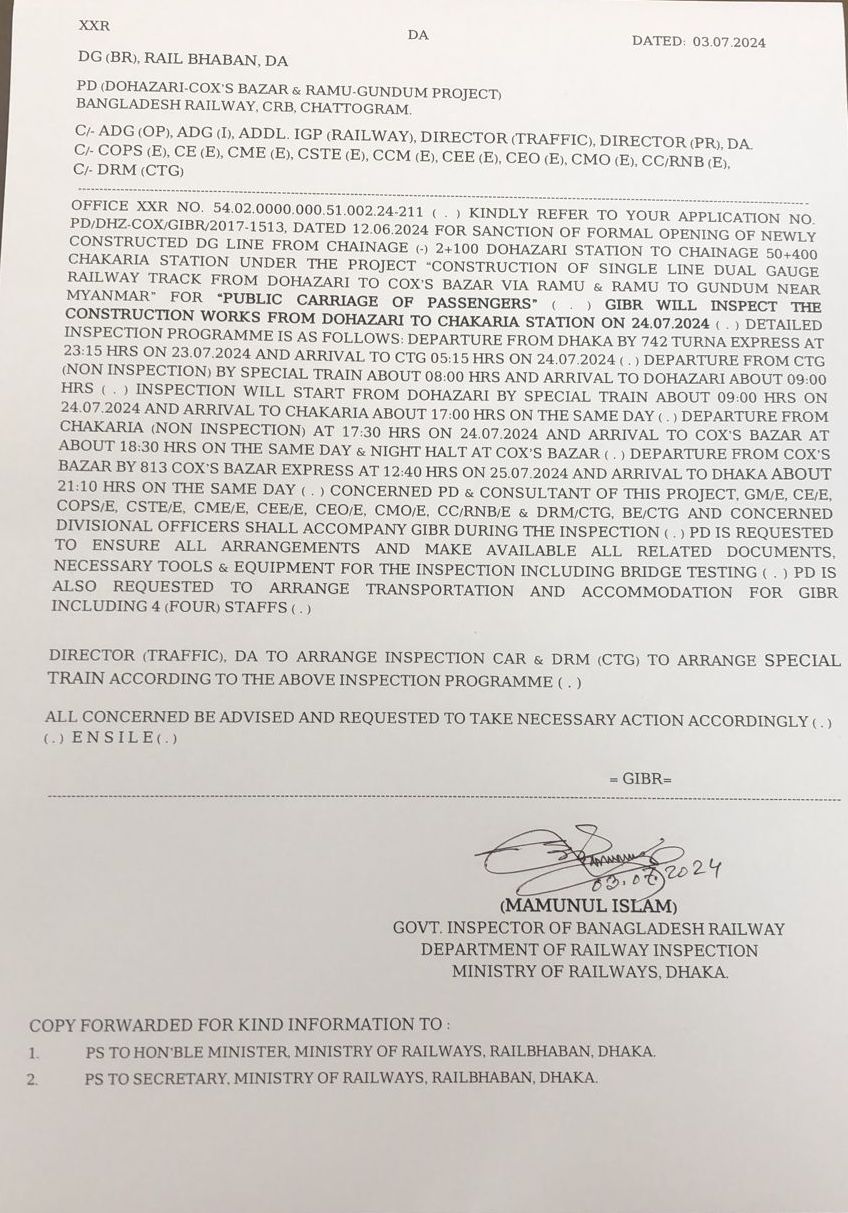 | ১ | সরকারি রেল পরিদর্শক আগামী ২৪.০৭.২০২৪ ইং তারিখে দোহাজারী হতে চকরিয়া স্টেশন পর্যন্ত নির্মাণ কাজ পরিদর্শন করবেন (লট-১)। | ০৩-০৭-২০২৪ | দেখুন | ||